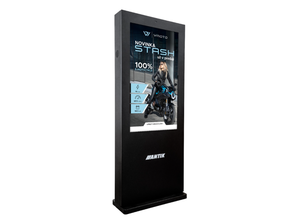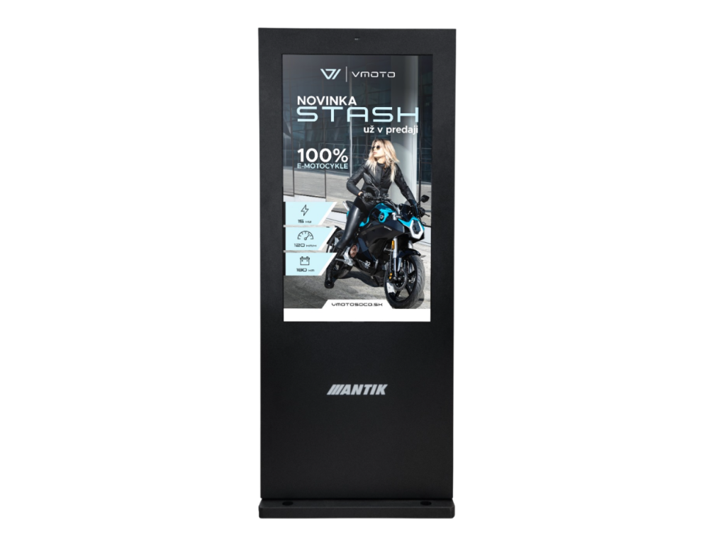 ANTIK Exteriérový displej s uhlopriečkou 55 palcov je digitálny displej určený na zobrazovanie obsahu, ako sú reklamy alebo informačné správy. Ide o efektívny nástroj marketingovej komunikácie smerom k cieľovému publiku. Oproti podobným produktom vyniká vlastnosťami ako sú odolnosť voči slnečnému žiareniu, vodotesnosť (štandard IP65), antireflexné sklo a veľmi dobrá viditeľnosť aj na priamom slnečnom svetle. Robustná konštrukcia s využitím kvalitných materiálov je zárukou, že zariadenie je dostatočne chránené voči nepriaznivému počasiu či vandalizmu. Integrovaný systém podporuje širokú škálu multimédií vhodných na prezentáciu rozmanitého obsahu v podobe obrázkov, filmu alebo hudby. Rýchlosť zariadenia je navyše podporená vysokorýchlostným prístupom k bezdrôtovému internetu. Nechýba ani možnosť rozšírenia o externé pamäťové zdroje formou dvoch portov štandardu USB 3.0 a MicroSD portu pre pamaťové karty.