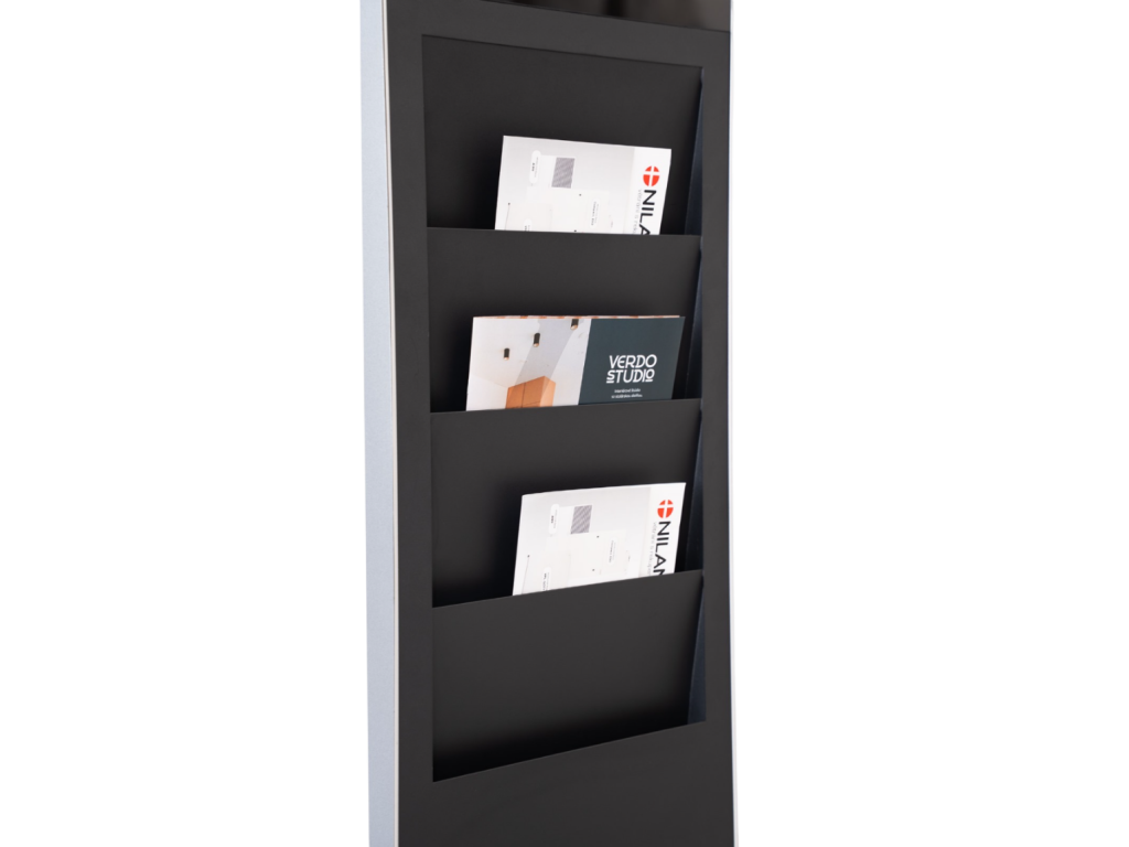 Voliteľný modul so zásobníkom umožňuje kombinovať digitálny obsah s tlačenými materiálmi. Umožňuje efektívnu prezentáciu ponuky v lobby, showroomoch či predajných miestach. Kovová konštrukcia dopĺňa displej o praktickú funkcionalitu. Dizajn je v súlade s moderným štýlom interiérových riešení. Modul je prispôsobený na rýchlu výmenu materiálov.