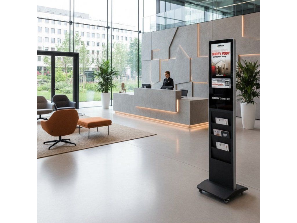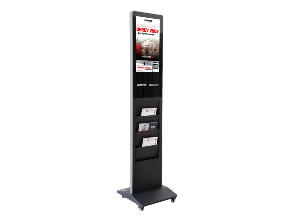 Model je vybavený aj praktickým držiakom na letáky, ktorý umožňuje kombinovať digitálnu prezentáciu s fyzickými propagačnými materiálmi - ideálne pre obchodné priestory, recepcie alebo lobby.