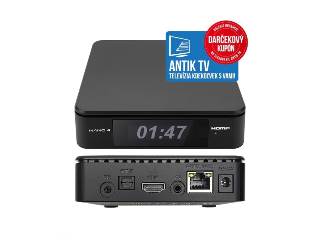Okrem televízie ponúka smart funkcie ako TV archív, nahrávanie, EPG, USB Media player, či mediálne aplikácie ako TA3, Mall TV, iKostol.sk, Kukaj.sk a mnohé ďalšie. Pre pripojenie Antik Nano 4 postačuje iba internet s priemernou stabilnou rýchlosťou 6 mbps od ktoréhokoľvek providera a sledujete televíziu tak, ako ste boli doteraz zvyknutí, napríklad pri satelitnom alebo káblovom príjme.