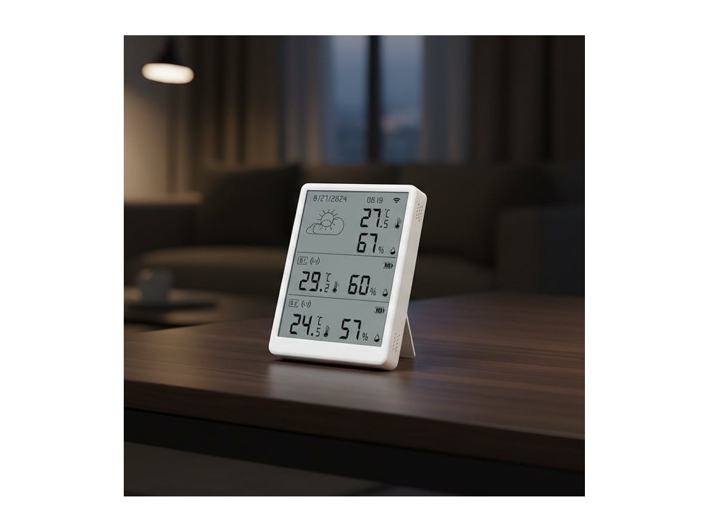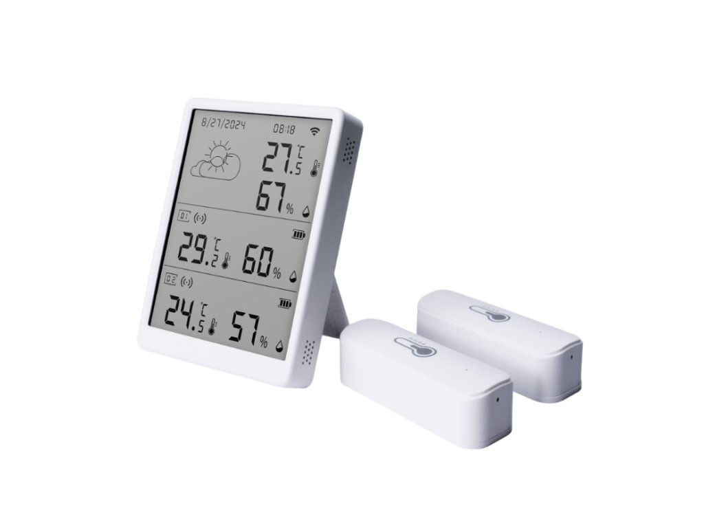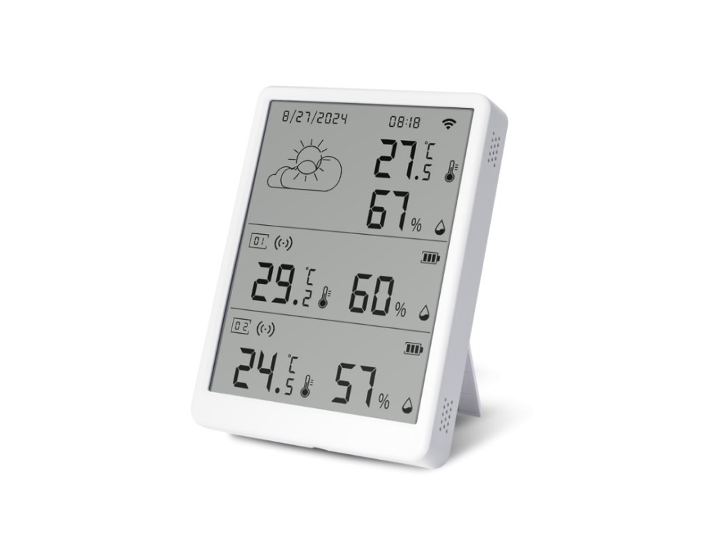 Hlavná jednotka má kompaktné rozmery 105 × 76 × 16 mm, takže ju ľahko umiestnite na stôl, poličku alebo stenu bez toho, aby zaberala zbytočný priestor. Je navrhnutá tak, aby pôsobila nenápadne, no zároveň poskytovala jasné a prehľadné informácie na displeji. Nízka hmotnosť 92 g umožňuje jej jednoduché prenášanie či premiestňovanie podľa potreby.