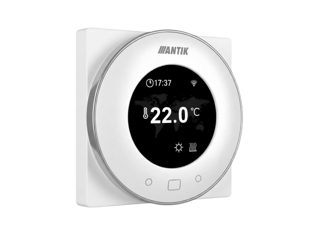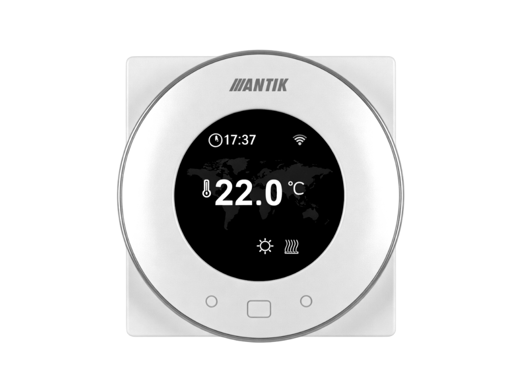 Zariadenie je vybavené 3,4-palcovým farebným dotykovým displejom, ktorý poskytuje prehľadné a intuitívne ovládanie. Na hlavnej obrazovke sa zobrazuje aktuálna aj nastavená teplota s možnosťou okamžitej úpravy. Termostat je možné ovládať lokálne priamo na zariadení alebo vzdialene prostredníctvom aplikácie Antik SmartHome. Prehľadné menu umožňuje rýchly prístup k plánovaniu, režimom a pokročilým nastaveniam. Používateľské rozhranie je navrhnuté pre jednoduchú a efektívnu každodennú obsluhu.